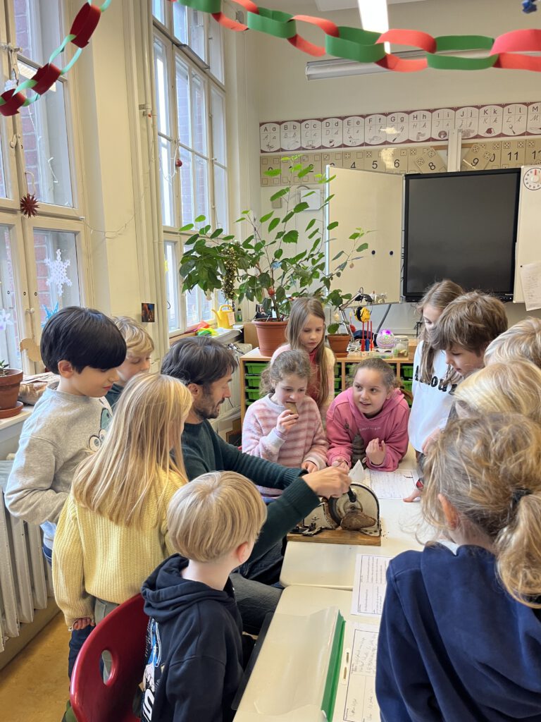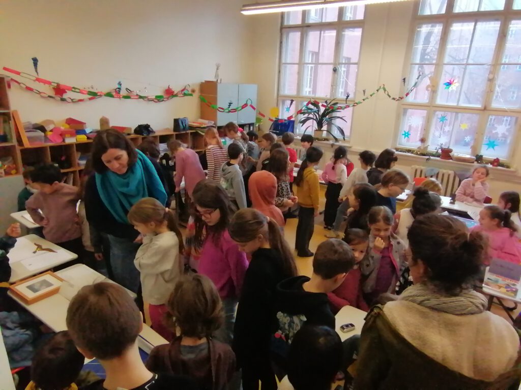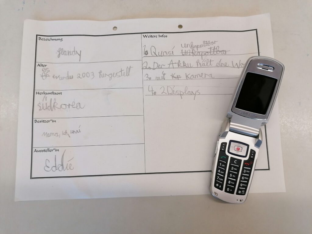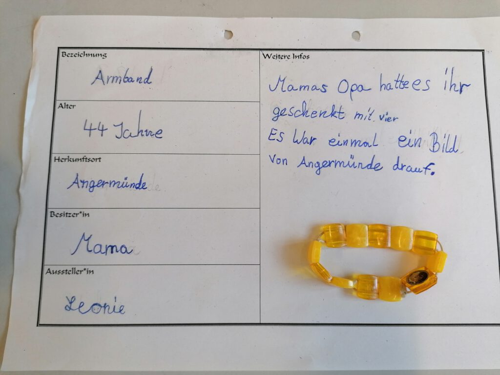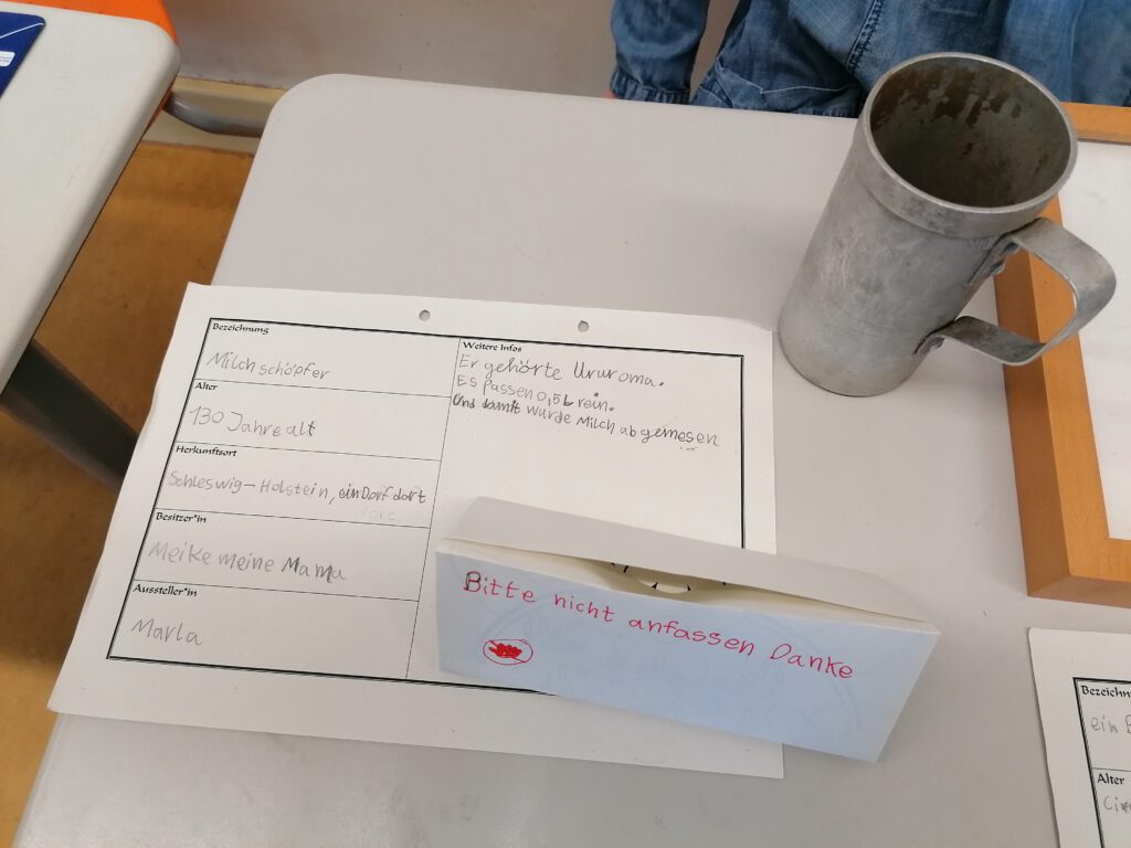 Wir haben ein Familuseum gemacht und jeder hat einen alten Gegenstand aus der Familie mitgebracht. Davor haben wir einen Steckbrief geschrieben. Dann kamen andere Klassen. Die Klassen haben sich die Gegenstände angeschaut. Herr Weingärtner hat eine Brotschneidemaschine mitgebracht und hat an alle Kinder Brot verteilt. Dann sind alle gegangen und danach haben wir alle den Klassenraum umgebaut.